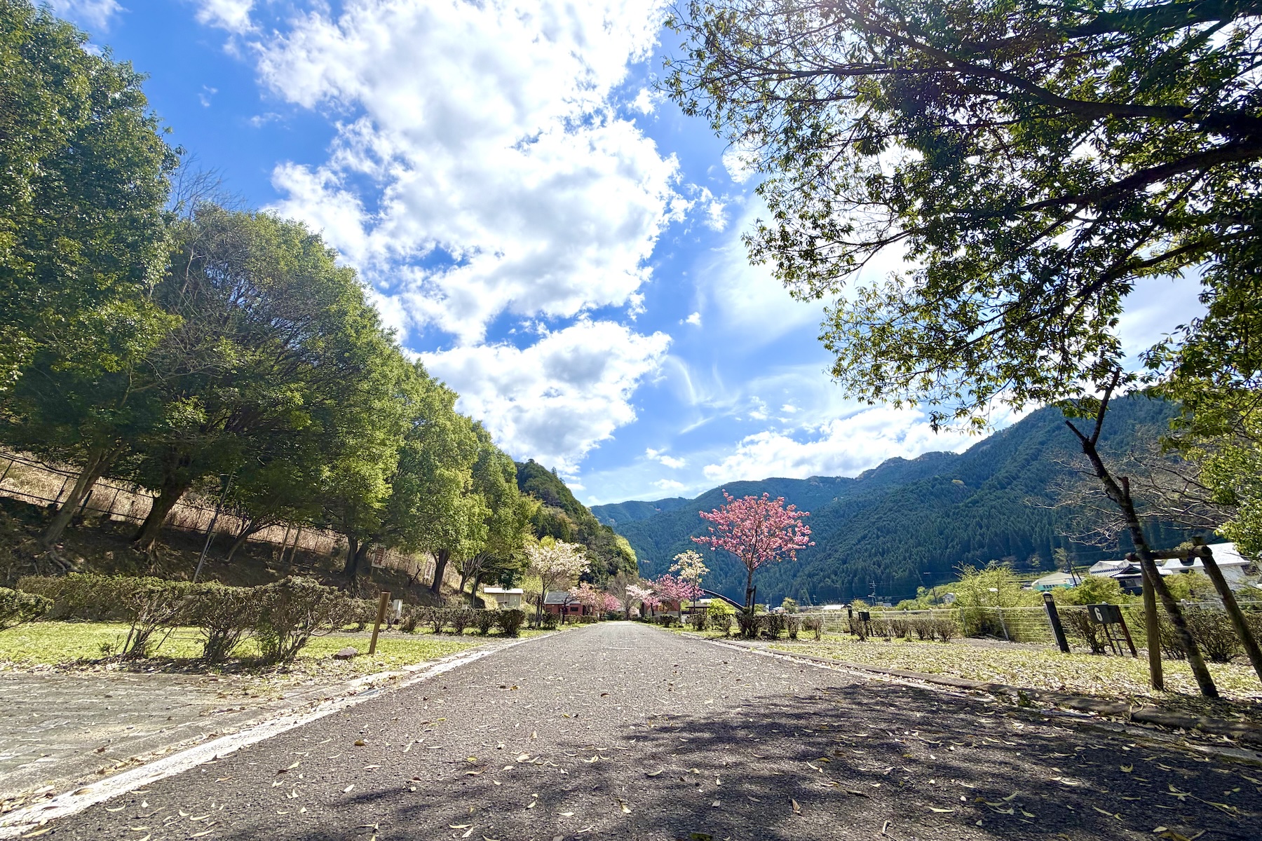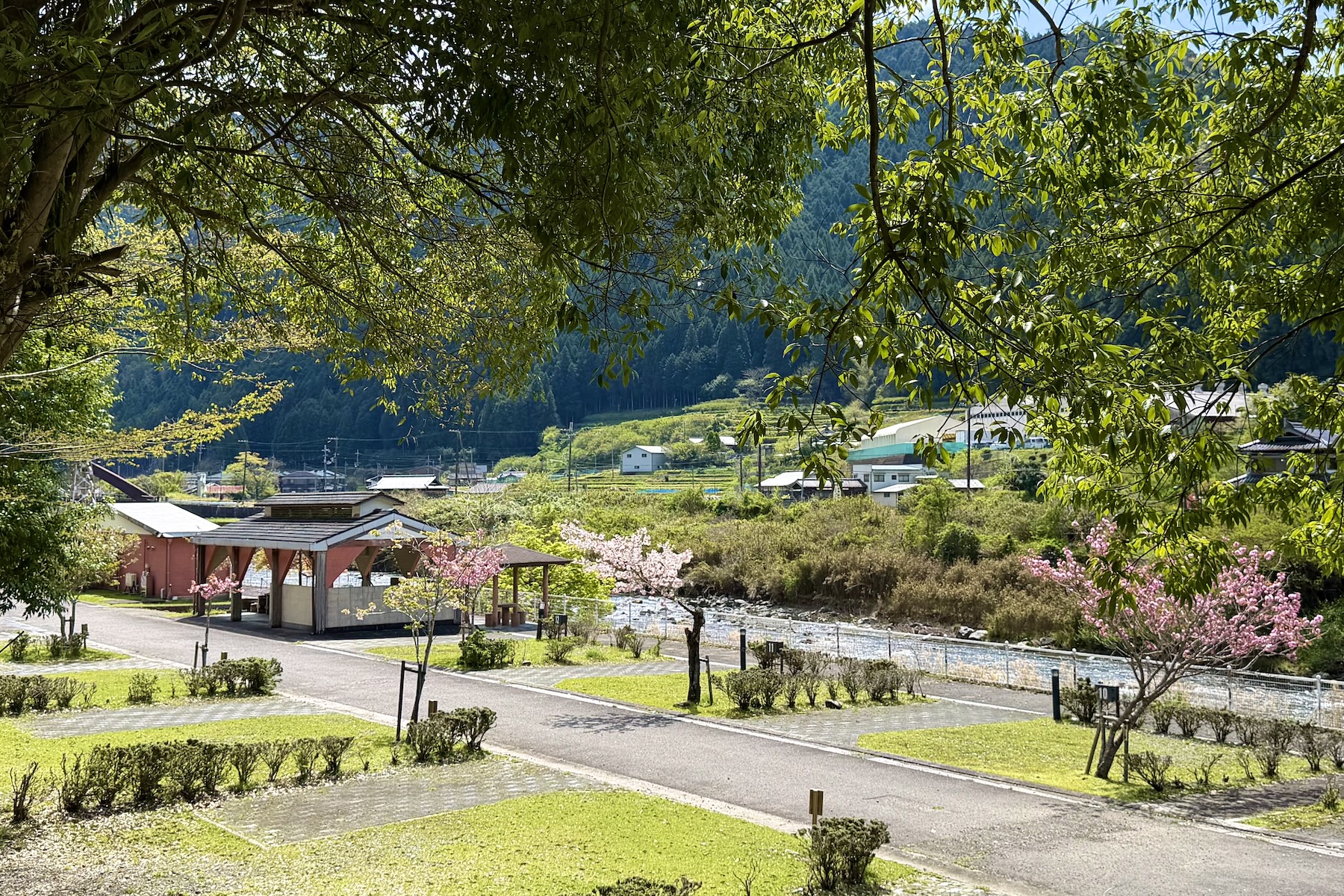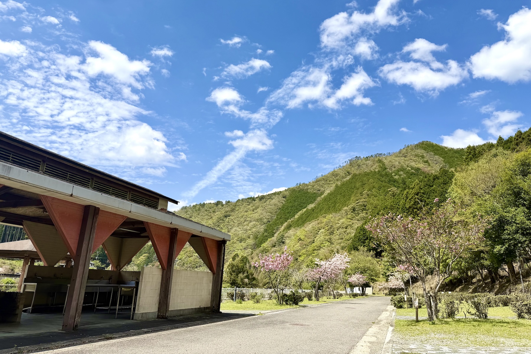 歴史ロマンの湯 しみず温泉から有田川上流に向け、国道480号線をクルマで走ること約3分。 対岸に見えてくるのがオートキャンプ場です。 広々とした敷地内に23区画をご用意しており、区画はすべてAC電源付き。 さらに1~4区画は水道付きでキャンピングカーもご利用OK。