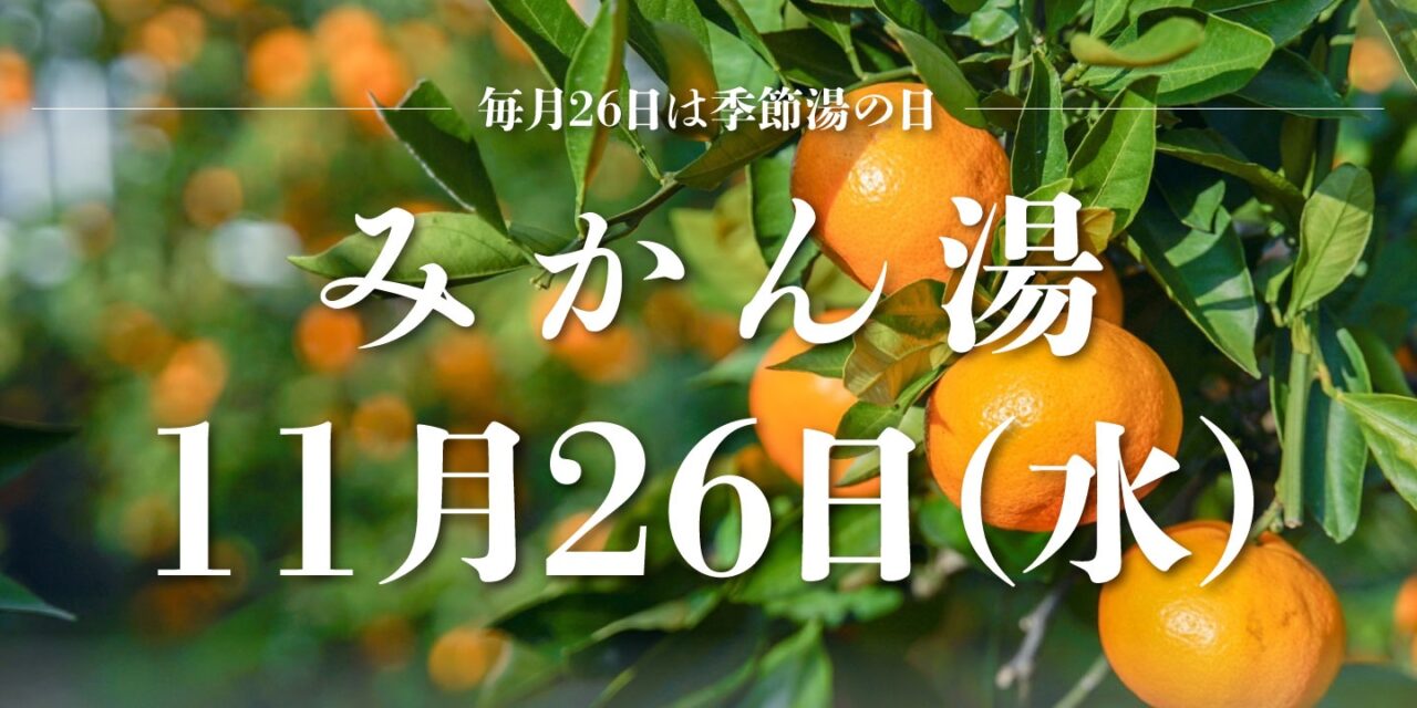 11月はみかんのお風呂。みかんの皮は「陳皮」として漢方で使われるくらい、身体に嬉しい成分がたくさん詰まっています。また、みかんの皮に多く含まれている「リモネン」は、柑橘系の香り成分でリラックスできる効果があるといわれています。その一方、新陳代謝のアップにもつながる可能性が期待できますので、おふろの発汗作用との相乗効果でさらに身体が温まります。
