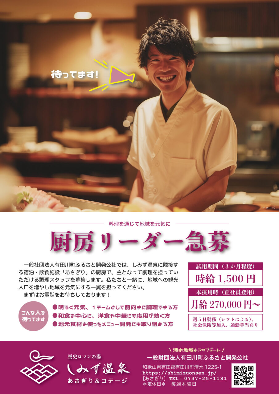 一般社団法人有田川町ふるさと開発公社では、しみず温泉に隣接する宿泊・飲食施設「あさぎり」の厨房で、主となって調理を担っていただける調理スタッフを募集します。私たちと一緒に、地域への観光人口を増やし地域を元気にする一翼を担ってください。