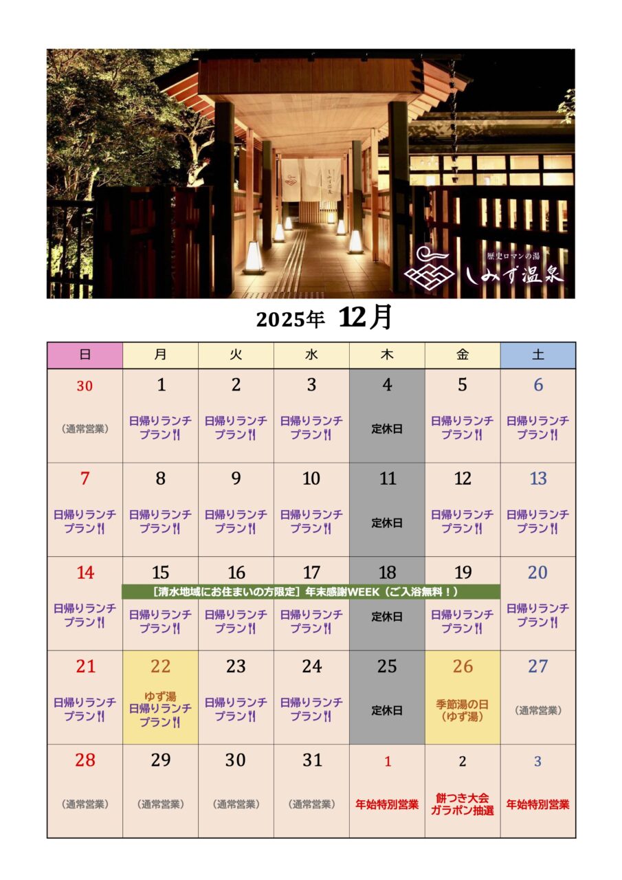 美肌のお湯と交互浴、“映える”浴槽が好評のしみず温泉では、12/26(金)から1/7(水)までの期間、休まず営業いたします(季節湯の日・12/26は柚子湯も楽しめます!)。