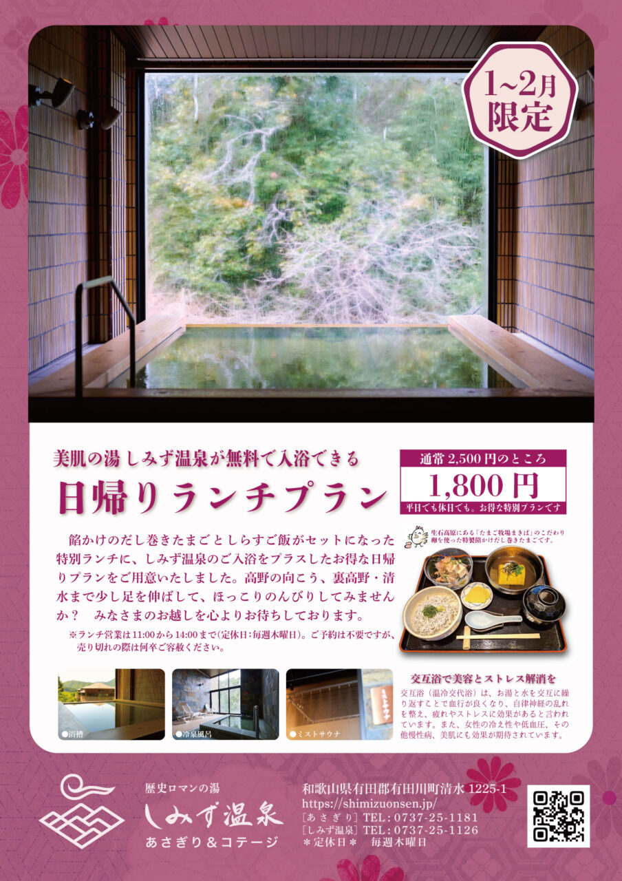 お食事としみず温泉のご入浴がセットになった、お得な日帰りプランを定番化。1月および2月は、これまでも通常メニューで好評をいただいていた「だし巻きたまご定食」を冬季限定でバージョンアップ。ふわふわのだし巻きたまごを、とろみのあるたっぷりお出汁でお楽しみください。また、今回から使わせていただくのは、当館から車で約25分、生石高原にある「たまご牧場まきば」さん自慢の卵。ぜひこの機会にご賞味ください♪