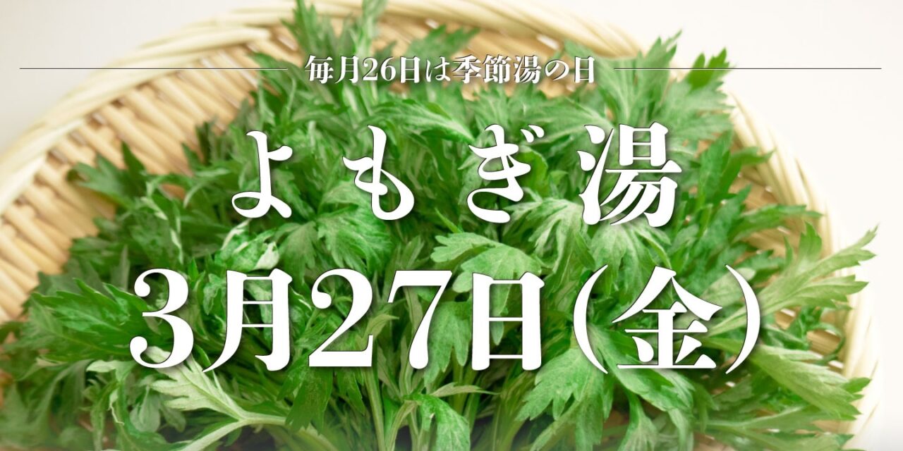 3月は定休日翌日の27日(金)、よもぎの葉のお風呂をお楽しみください。よもぎは、腰痛や神経痛などに効果が期待され、昔から多くの人に親しまれている万能薬草のひとつ。東洋医学では外用と内用どちらでも使える生薬として位置づけられています。また、よもぎの香りにはリラックス効果があり、睡眠の質をあげてくれるともいわれています。身体の痛みにお悩みの人や、緊張状態になりやすい、睡眠の質があまりよくない人によもぎ湯はおすすめです。