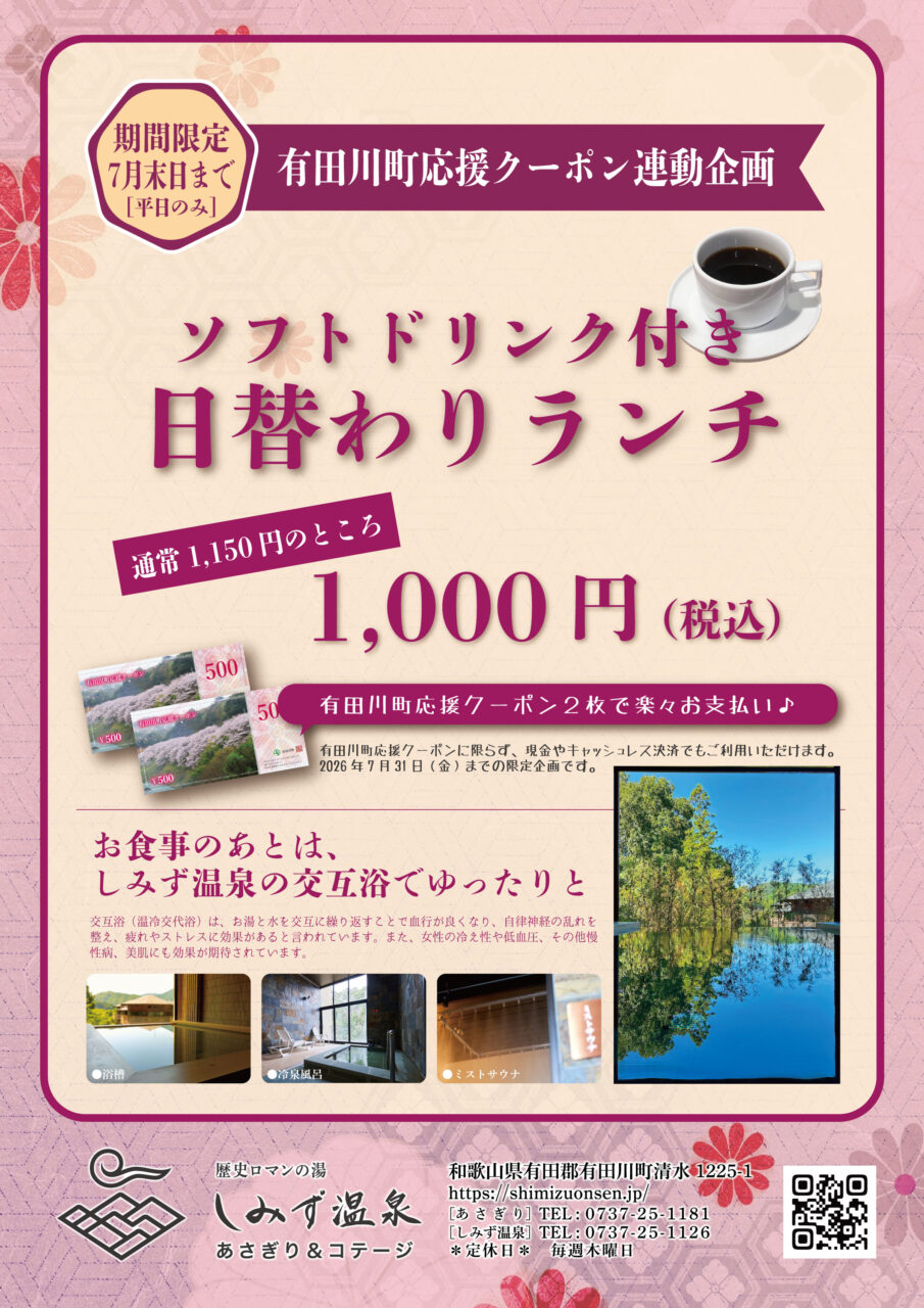 有田川町が住民の生活支援のために発行する“有田川町応援クーポン(第8弾)”。町内のお店で利用できる1人あたり15,000円分のクーポン券ですが、いよいよ各ご家庭にも届きはじめましたね^^ “歴史ロマンの湯”しみず温泉のご入浴やあさぎりでのお食事・ご宿泊にももちろんお使いいただけますので、ぜひご利用くださいね。