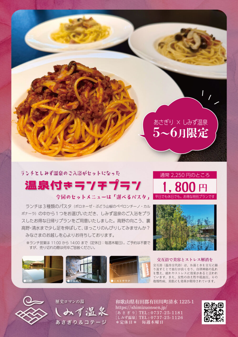 お食事としみず温泉のご入浴がセットになった、大好評の温泉付きランチプラン(旧:日帰りプラン)。5月および6月のセットメニューは、3種のパスタ(ボロネーゼ・ぶどう山椒のペペロンチーノ・カルボナーラ)の中からお好きなパスタを1つお選びいただけます♪